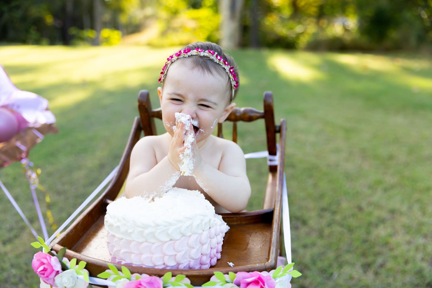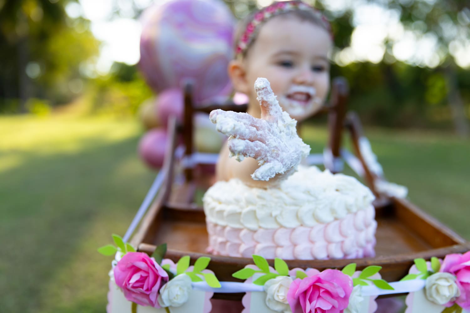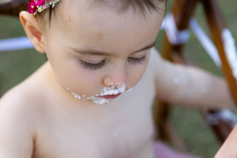 Macee needed no encouragement to dive into her cake. With tiny hands and an adventurous spirit, she smeared frosting all over her face, creating a delightful mess that every parent dreams of.