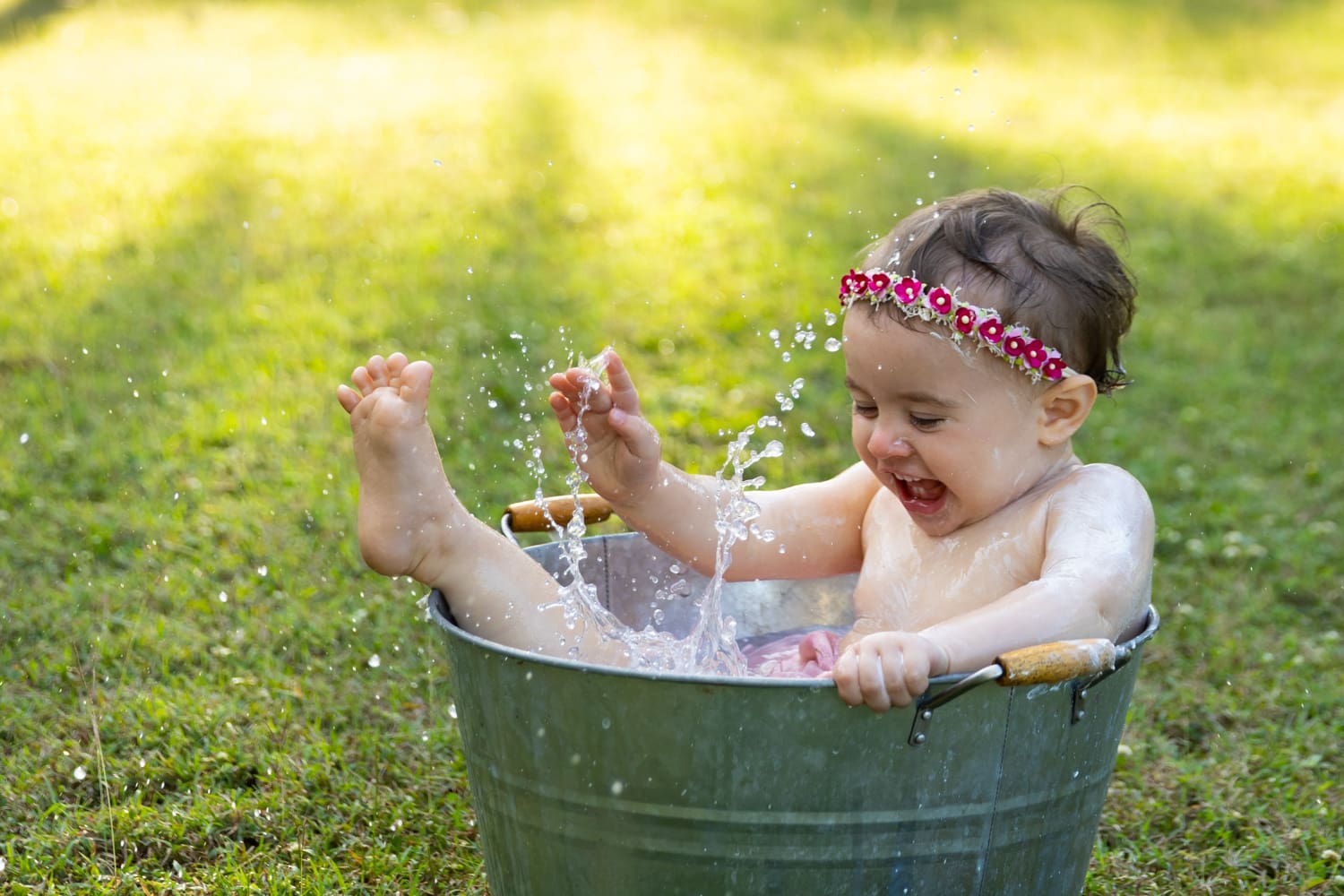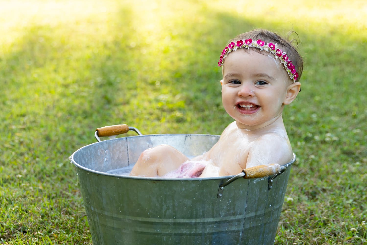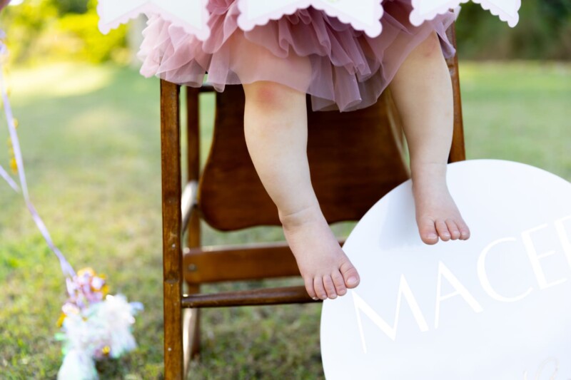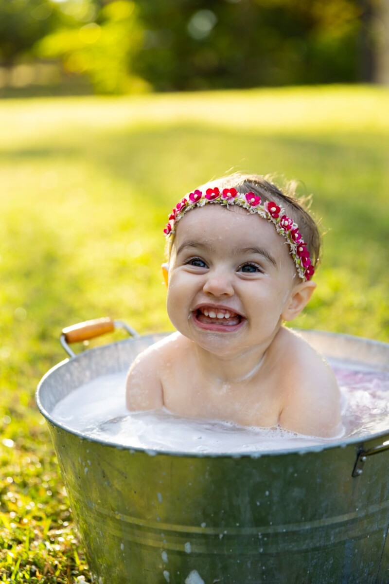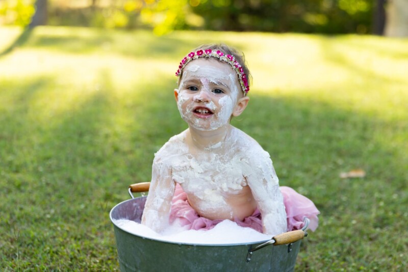 After the cake smash, it was time for a bath to clean up. Macee’s laughter continued as she played with the bubbles, and the joy of the moment was captured in every click of the camera.