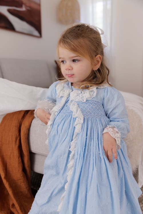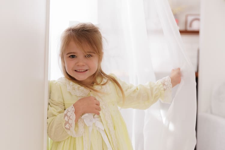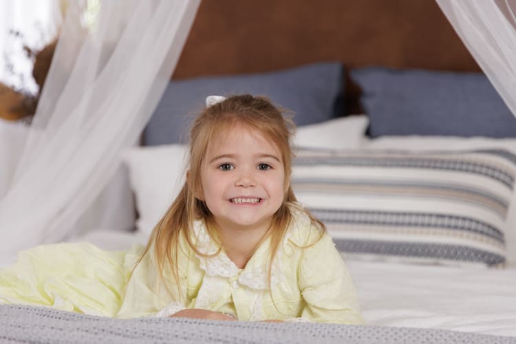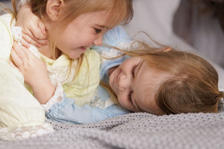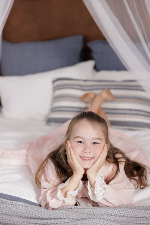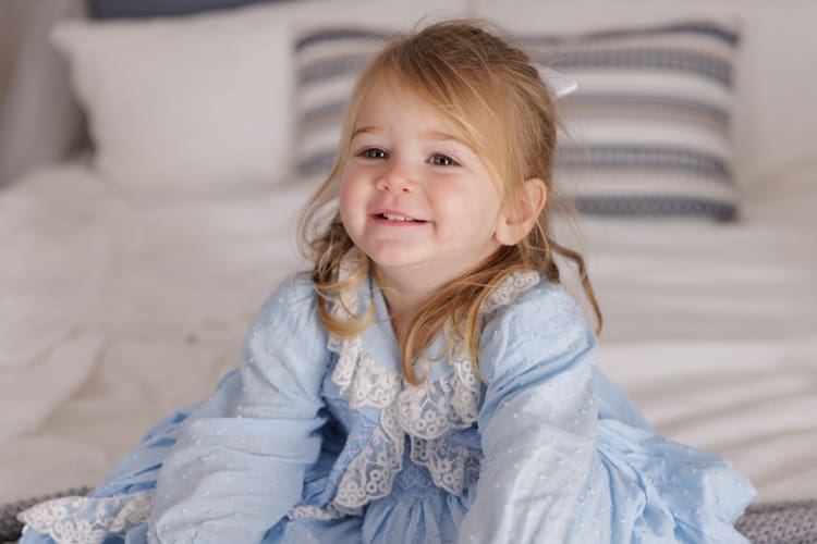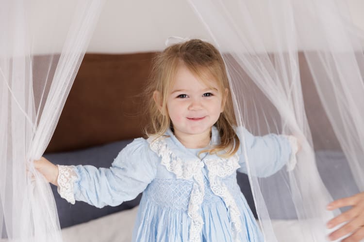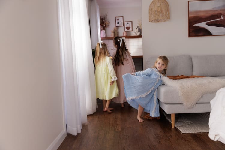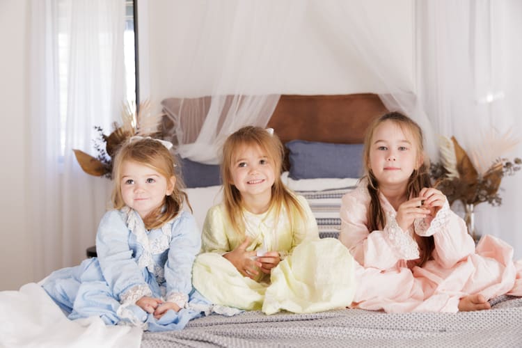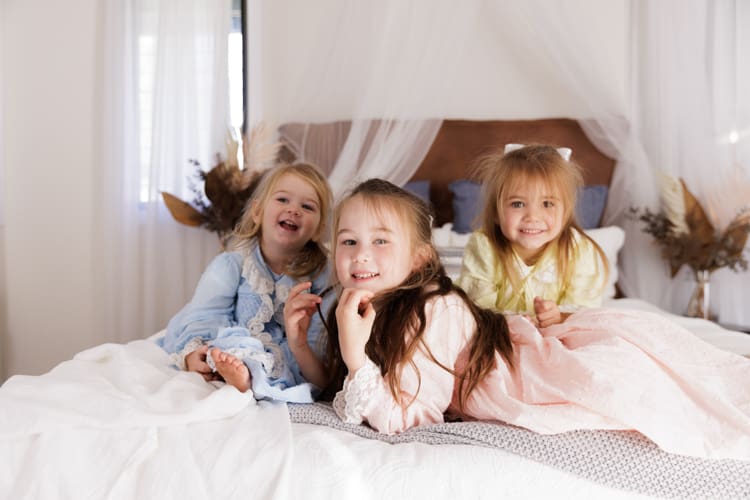 Mum is a creative soul! All of the gorgeous outfits these girls come in are usually handmade. Mum had the idea to do a studio session in these adorable little dresses. The girls had the best time – plenty of giggling, bouncing on the bed, and hiding under sheets.